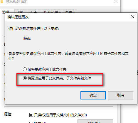 2、在 隐藏的框框点击鼠标左键打个钩钩,再点击确定按钮,这样这个文件夹就变成了隐藏文件夹,选择第二个选项 奖更改应用于此文件夹、子文件夹和文件,点击确定。 这样就看不到这个文件夹下的内容了。