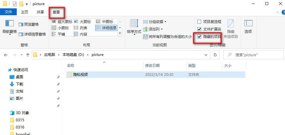 如果我们把 显示隐藏的项目的钩钩再点击一次,就是取消 ,那个文件夹又消失了