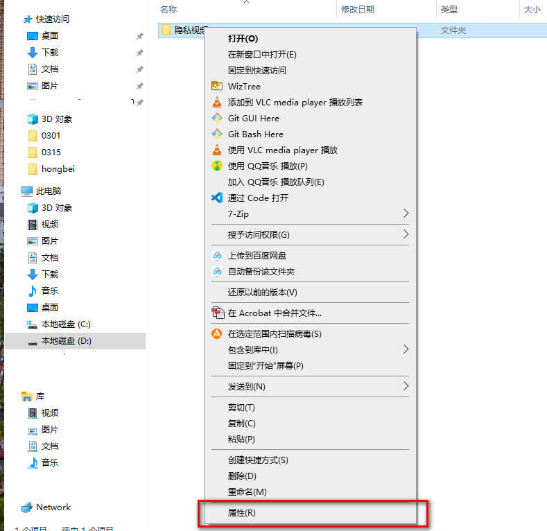 1、在需要隐藏的文件夹上点击鼠标右键,在属性上点击鼠标左键。