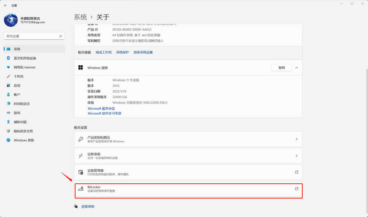 3、在“关于”选项右侧设置界面移动到自动最下面,在相关设置 下点击 【BitLocker 设置】;