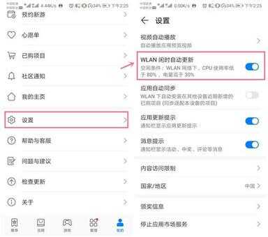 操作方法:打开应用市场→在【我的】页面下打开设置→关闭【WLAN闲时自动更新】选项