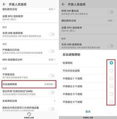 操作方法:打开设置→进入系统→开发人员选项→进入后台进程限制,在这里我们就可以手动选择后台运行程序数量。