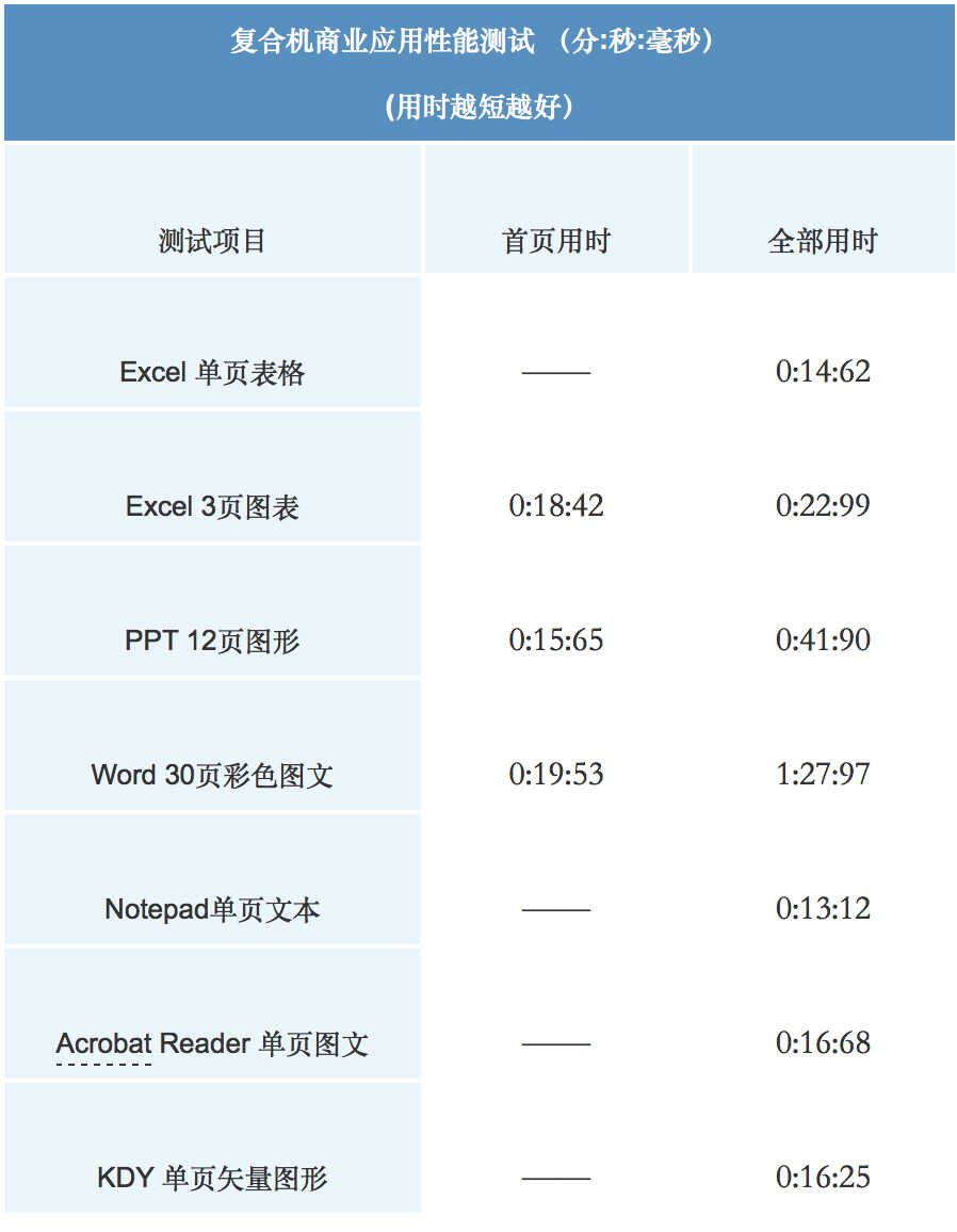 来看东芝e-STUDIO2510AC复合机的打印、复印、扫描速度实测结果。Excel图表、PPT和Word文件打印速度换算得到分别为26.3ppm、25.2ppm和25.4ppm,均略高于标称值25ppm。这是略高于入门级的水平。另外单页打印、多页打印的首页输出用时也比较短,打印无需等待太长时间。