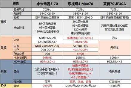 说起价格,以市面上我们可以搜索到的70英寸电视来看,目前小米电视3应该是售价姿态最低的一款。其主要竞品大致是夏普的70UF30A以及乐视超4 Max70,面对竞品,小米电视3 70英寸售价是否合理?性价比能否成为它竞争其他两家的砝码?咱们来看个表格: