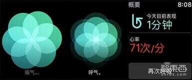 Apple Watch原生应用带来的一个很有用的是呼吸应用,开启这个应用之后,会指导你深呼吸,节奏的控制既可以通过变化的动画图形给你提示,也可以通过有节奏的腕部震动来提醒,在工作之余放松放松很有帮助。
