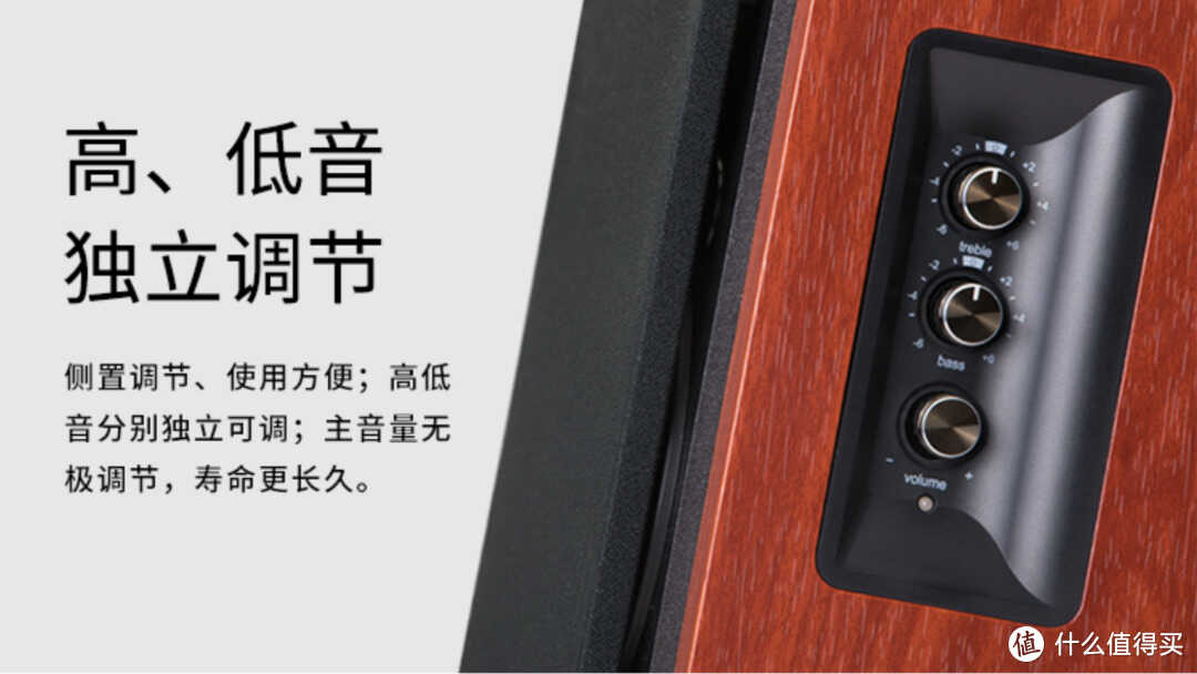 采用4英寸中低音单元+13mm高音两分频设计,主音箱侧面提供高音、低音、音量调节旋钮,方便调节。