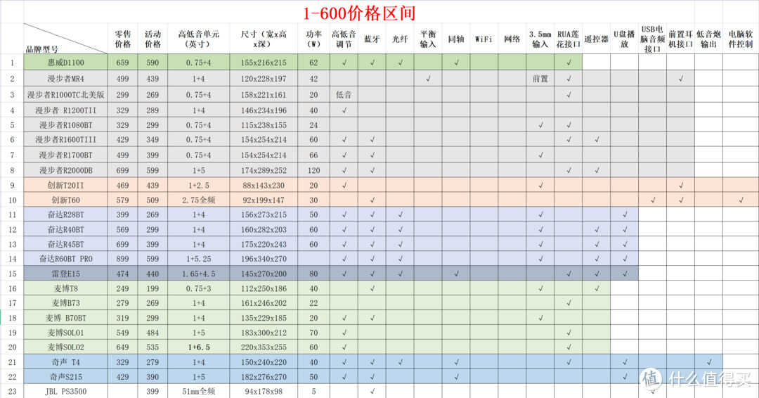 为大家整理了23款600元以内性价比较高的产品,先上个一览表