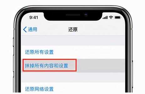 1.打开手机之后找到设置,依次点击“设置”>“通用”>“还原”,然后找到“抹掉所有内容和设置”,点击该选项。
