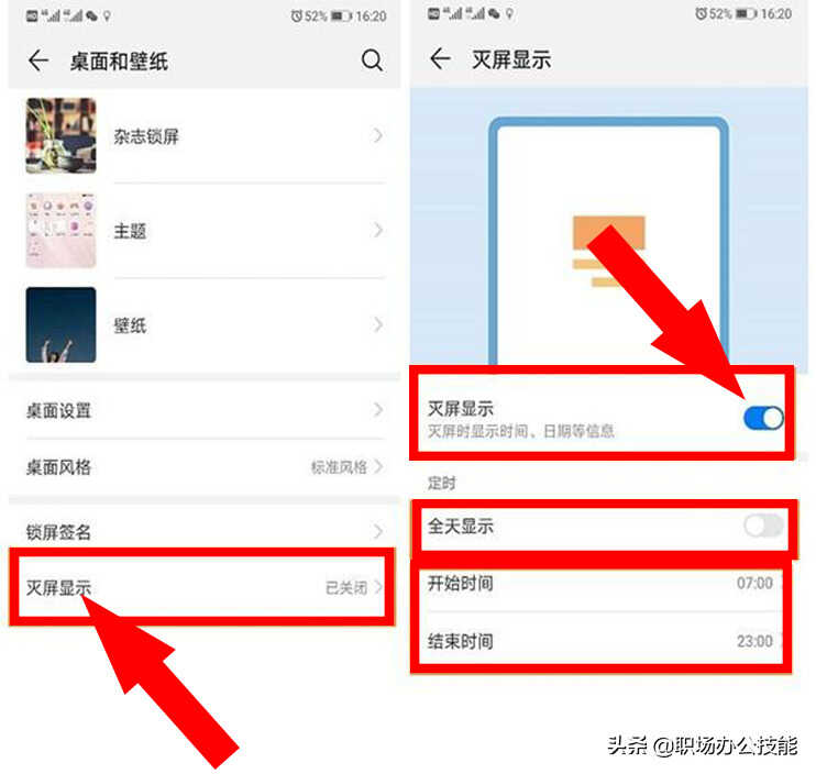 华为手机里的这个功能叫做“灭屏显示”,这个名称也非常贴切,就是屏幕熄灭的时候也能显示时间。那么我们该如何设置呢?首先打开手机【设置】,然后找到【桌面和壁纸】,在点击【灭屏显示】,最后根据自己的需要设置显示时间即可。
