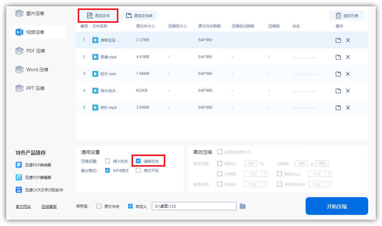 使用方法非常简单,选择对应的压缩功能,然后点击【添加文件】,一次上传几十、上百个文件,选择【清晰优先】,这样压缩后的文件可以保留画质。