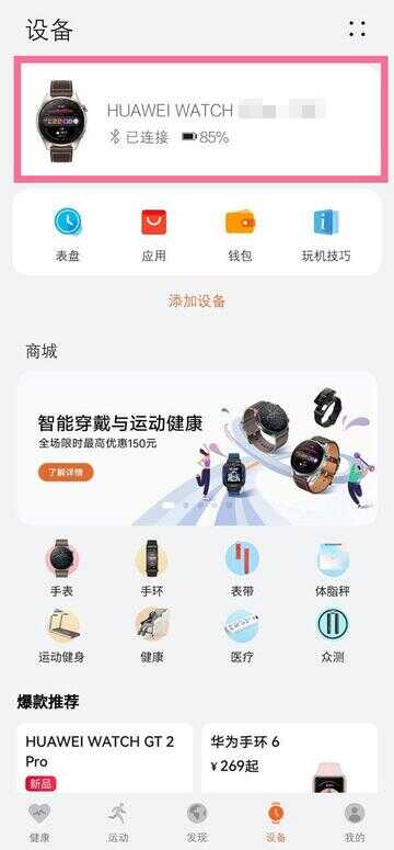 1、打开华为运动健康APP,在“设备”界面点击绑定的设备,进入手表详情页。
