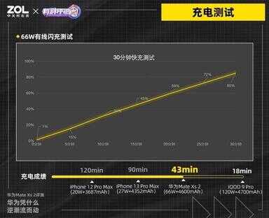 而说到充电,华为为Mate Xs 2配备了66W超级快充,在功率上属于当前折叠屏手机的第一梯队,那么Mate Xs 2的实际充电速度如何呢?我们通过测试来看看。