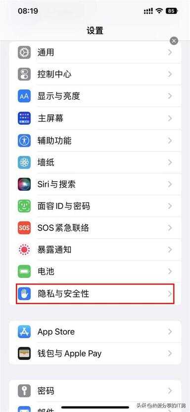 1、在主屏幕上轻点“设置”,下滑找到并轻点“隐私和安全性”。