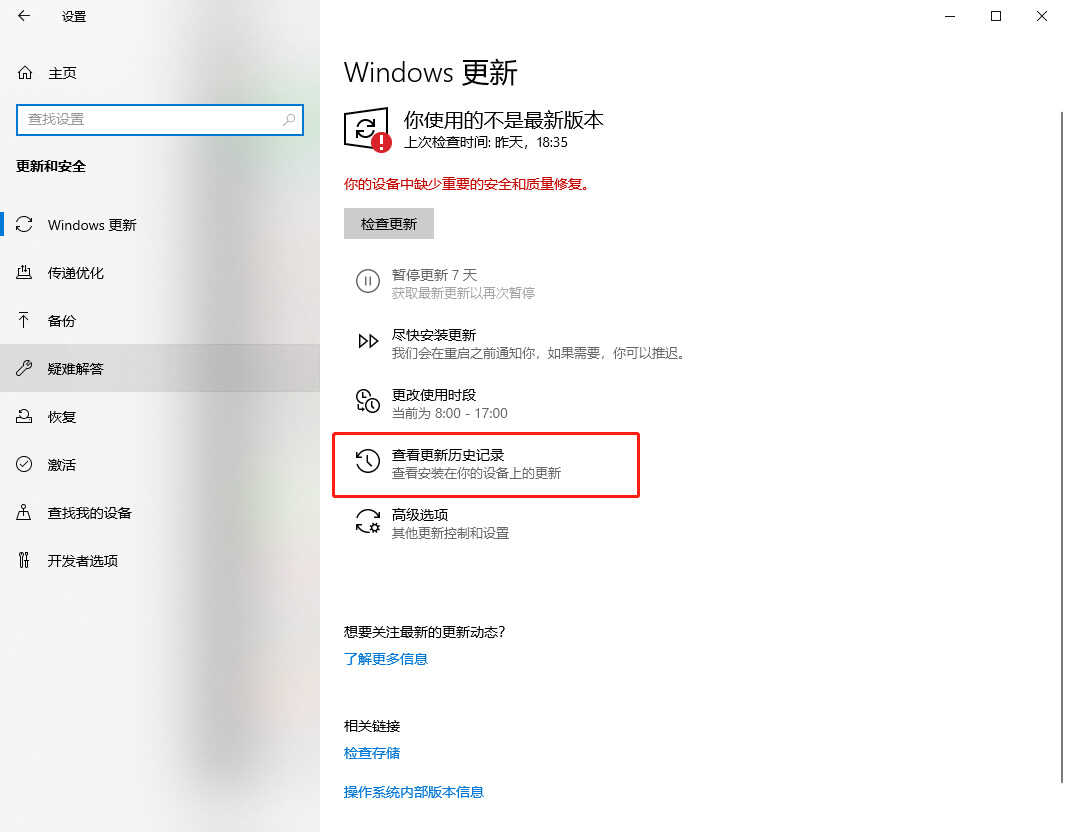 打开设置——》更新和安全----》 Windows更新----》“查看更新历史记录----》卸载更新