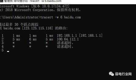 例4、“tracert -h 3 baidu.com”代表本次tracert搜索的最大跳数,输入3表示搜索在路由器跳转3次,如下图所示: