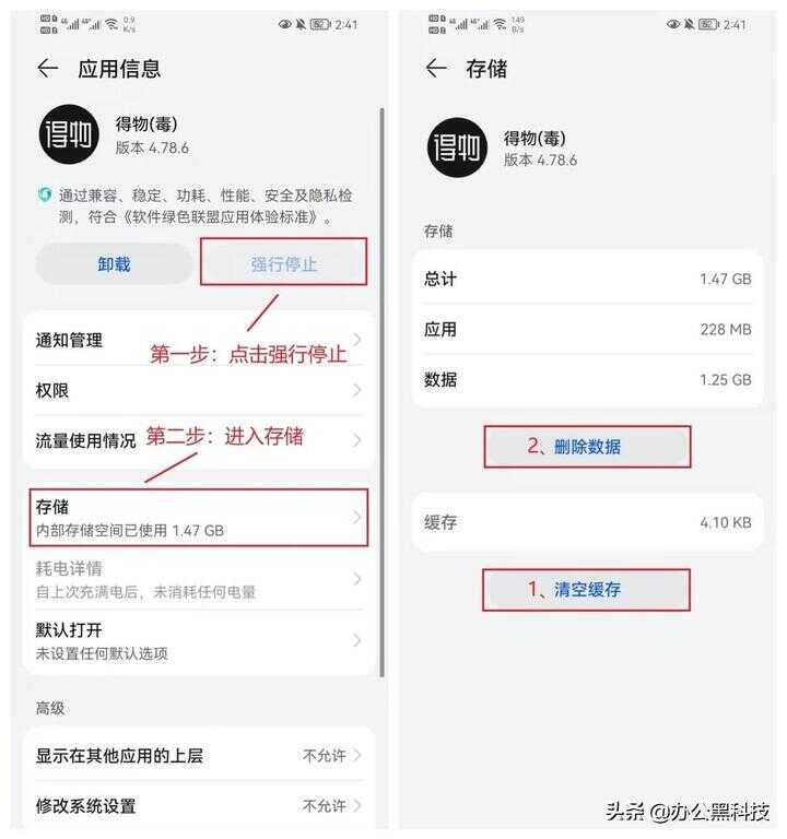 停止应用是为了防止它运行时继续产生缓存垃圾,然后我们点击【存储】,就可以看到应用所占用的内存和缓存垃圾,先点【清除缓存】后再点【删除数据】。(注:谨慎清理)