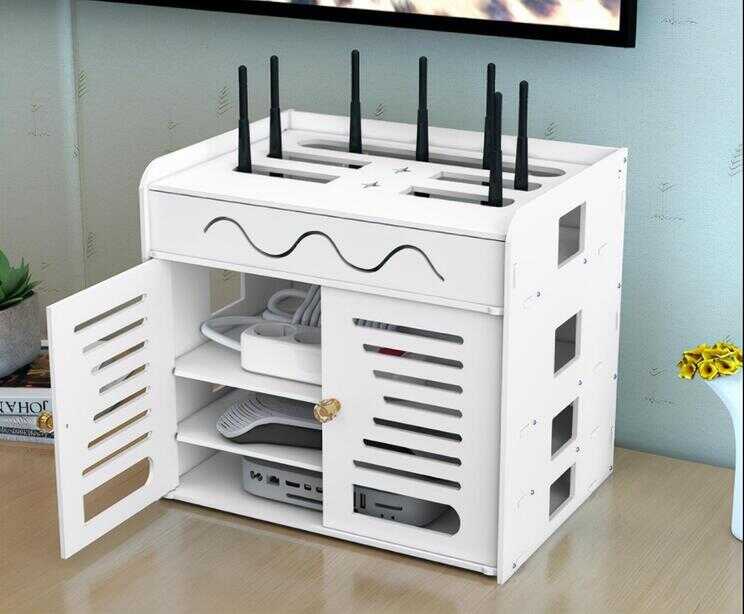 在这一部分当中,你可能会面临一个问题,那就是在电视墙的位置,既摆放路由器,又摆放机顶盒,还有插排,会显得非常凌乱,这时候,你可以购置一个收纳盒,让电视柜这里显得更加整洁,这个东西不用提前买,等你装修完以后,安装宽带的时候再买就行。