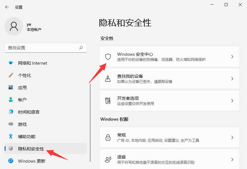 2、找到“隐私和安全”进入后,点击右侧的“windows安全中心”。