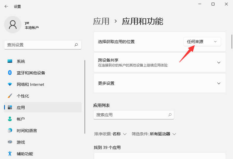 3、在选择获取应用的位置那里,我们选择其中的”任何来源“选项即可。