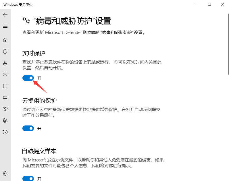 5、最后将其中的“实时保护”关闭就可以了,这样就不会被安全中心阻止导致安装不了,不过小编建议大家平常还是打开安全中心,这样能有效保障使用系统的安全。