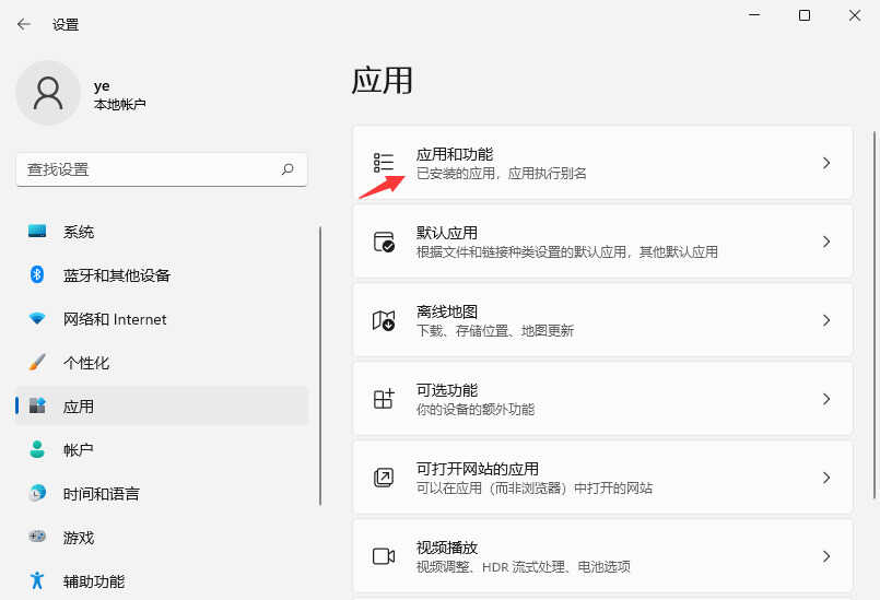 2、在设置界面的左侧打开”应用“功能,选择右侧的”应用和功能“进入。