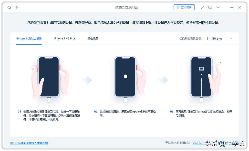 再按照提示操作将iPhone置入恢复模式或DFU模式,一般情况下将iPhone置入恢复模式即可。