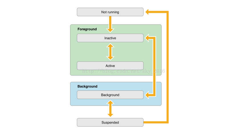 Suspended(挂起):程序在后台不能执行代码。系统会自动把程序变成这个状态而且不会发出通知。当挂起时,程序还是停留在内存中的,当系统内存低时,系统就把挂起的程序清除掉,为前台程序提供更多的内存