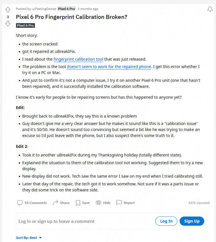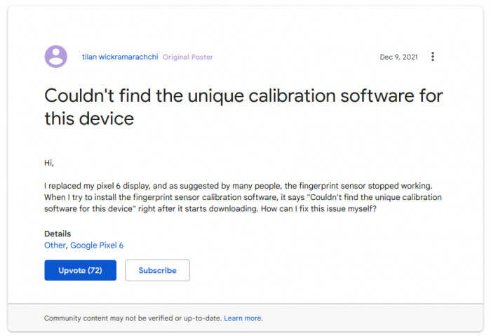 在 Reddit 社区和 Google Support 的帖子中,一些 Pixel 6 系列用户表示在更换显示屏后无法使用他们的 Pixel 6(和 6 Pro)的指纹传感器。即使这些换屏是在那些由 Google 官方认可的服务店(例如 UBreakIFix)修复的,依然存在这样的问题。即使是那些应该能够维修 Google Pixels 的技术人员,也不能让这个工具每次都能发挥作用。