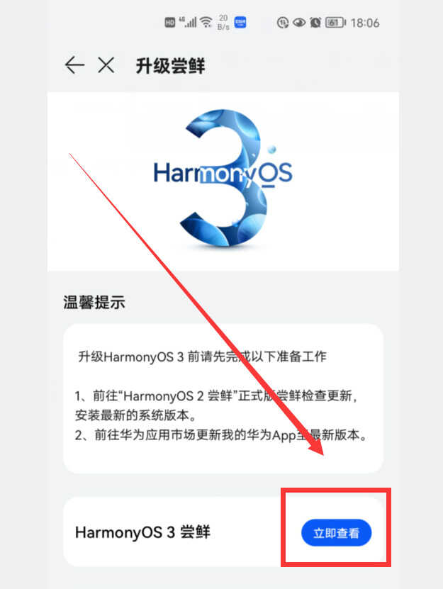 然后点击“HarmonyOS 3 尝鲜”右侧的“立即查看。