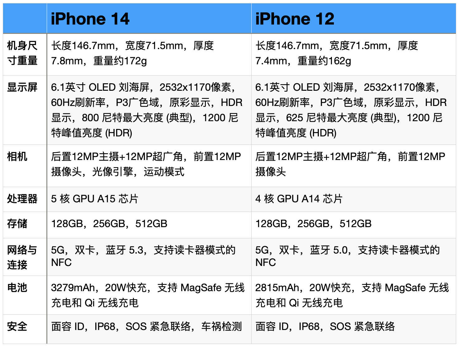 iPhone 14 和 iPhone 12 主要参数对比图: