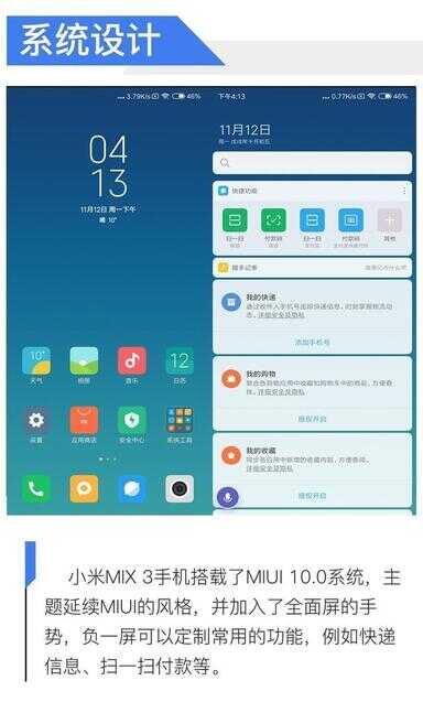 MIUI 10以全面屏设计为核心,虽然目前加入了全面屏手势,但仍有很多功能不够完善,像宣传的的滑盖设置,我手里这台小米MIX 3手机上并没有添加,每次滑动屏幕都是默认打开相机的操作,所以新一代的全面屏交互方式,并不能一滑即达,看来这个功能还不是很完善。