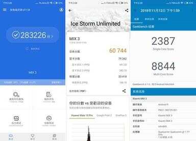 经过测试,小米MIX 3手机在安兔兔软件上跑分达到283226分,3D Mark软件上测试分为60744分,Geekbench软件上单核跑分为2387分、多核跑分为8844分。虽然搭载了高通骁龙845处理器,但并没有发挥出它的最大性能,跑分都处于正常水平。