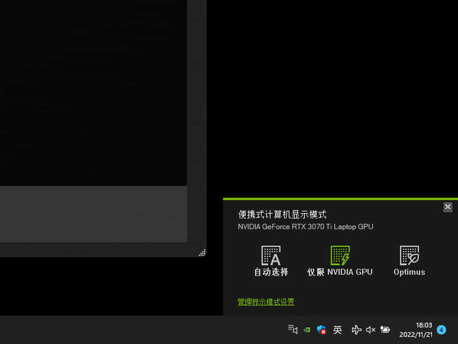 点击“Advanced Optimus”,系统桌面右下角会调出显卡模式选项。选择“仅限NVIDIA GPU”,便是独显直连模式。