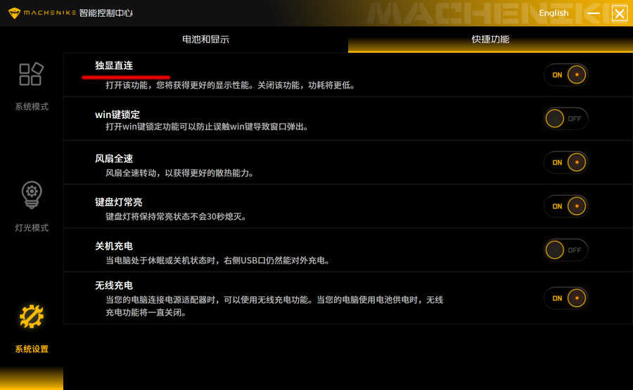 在MACHENIKE智能控制中心里面的“系统设置-快捷功能”界面下,开启独显直连。