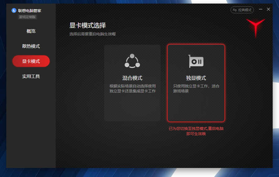 在显卡模式切换选项里面设置成“独显直连”,电脑重启之后便是独显直连模式。
