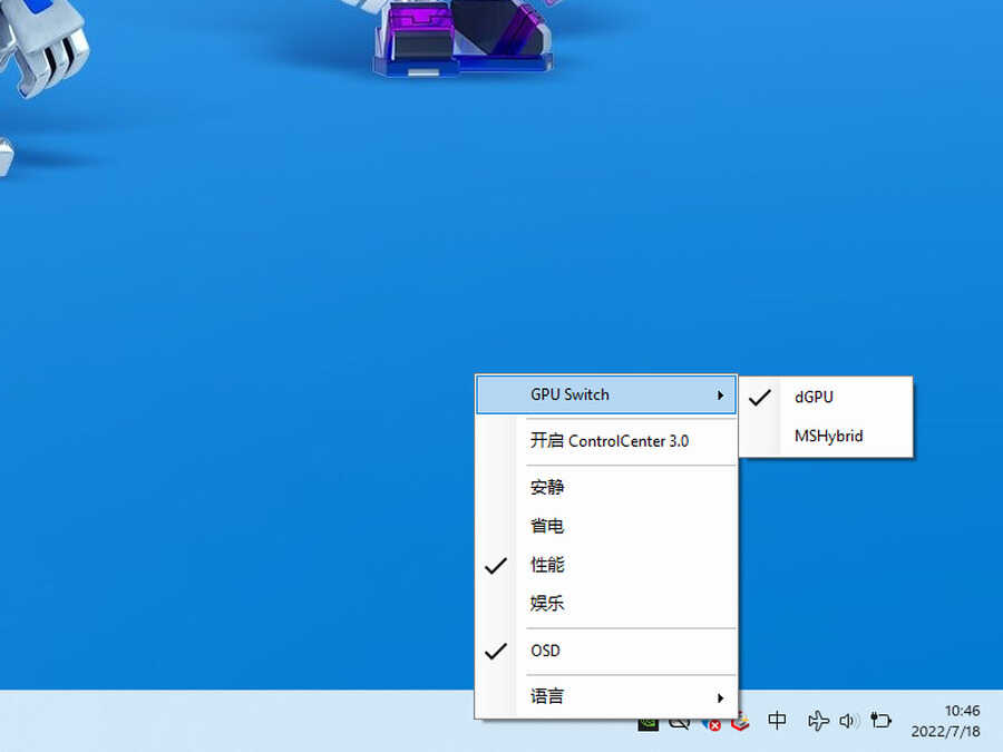 第1种方法,右键单击CONTROL CENTER控制软件的小图标,将GPU Switch选项设置为dGPU,即是独显直连模式。