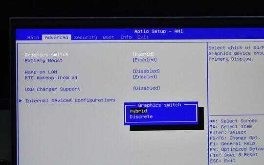 开机进入BIOS,在Advanced界面下的Graphics Switch选项里,将其设置成“Discrete”,重启电脑后就是独显直连模式了。另,Hybrid是显卡混合输出模式。
