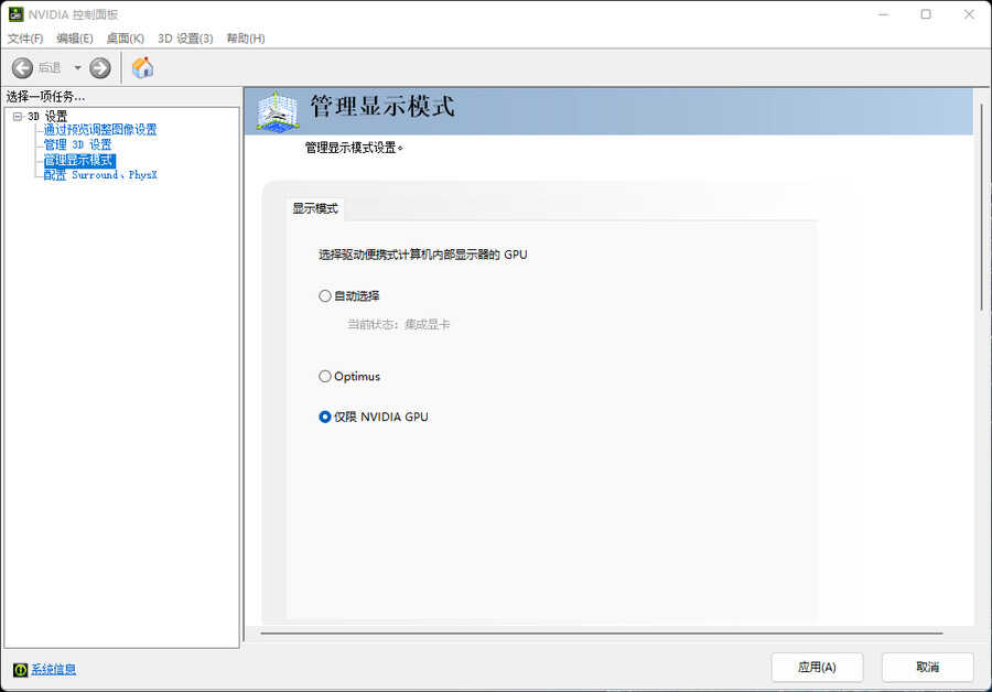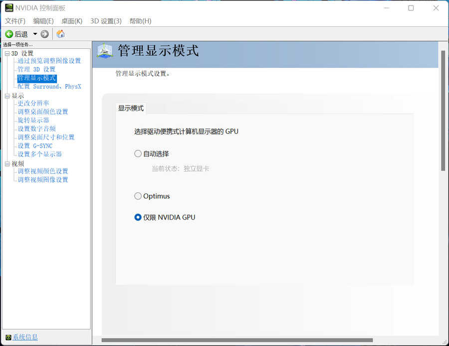 在“NVIDIA控制面板里面的管理显示模式界面下,将显示模式设置成“仅限NVIDIA GPU”,保存设置后,系统便是独显直连模式。