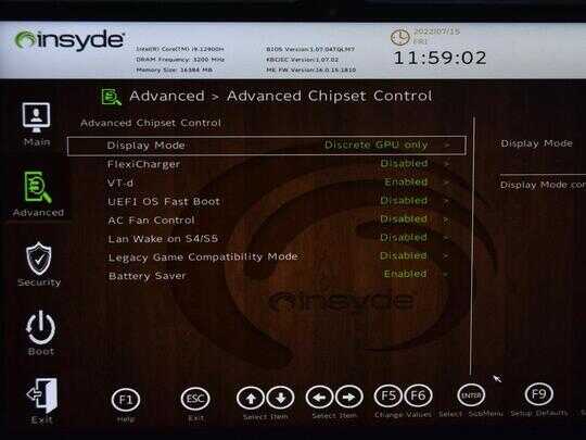 第2种方法,开机进入电脑BIOS,在Advanced>Advanced Chipset Control界面下,将Display Mode(显示模式)设置为Discrete GPU only,即是独显直连模式。