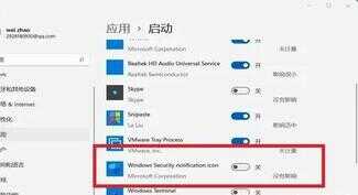 3、随后退出注册表,再右键开始菜单,打开“设置”,进入左边栏的“应用”,进入右边的“启动”设置,在其中找到安全中心,将它关闭即可