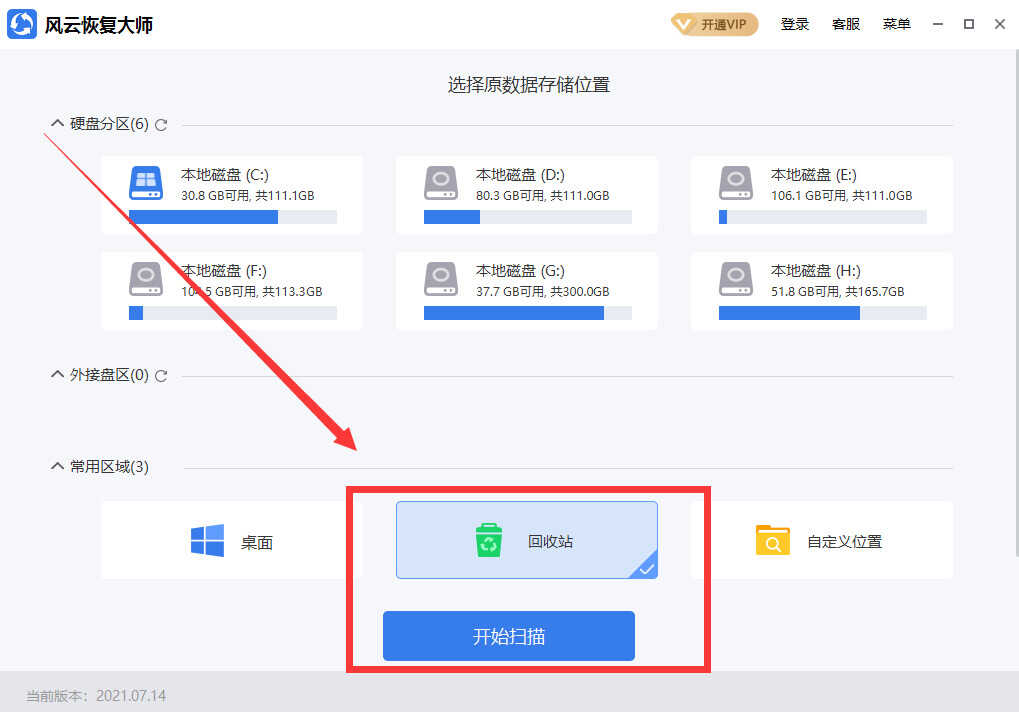打开风云恢复大师,选择回收站进行扫描。
