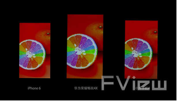 我们回到正面来,畅玩4X这块屏幕的观感还是很不错的。色彩的还原比小米4都要好上一些。饱和度也没有刻意拉得太高来增强视觉冲击,还是比较忠实于还原真实的。而小米4明显是有些用力过度,橙色的橙子都快被还原成正红色了。