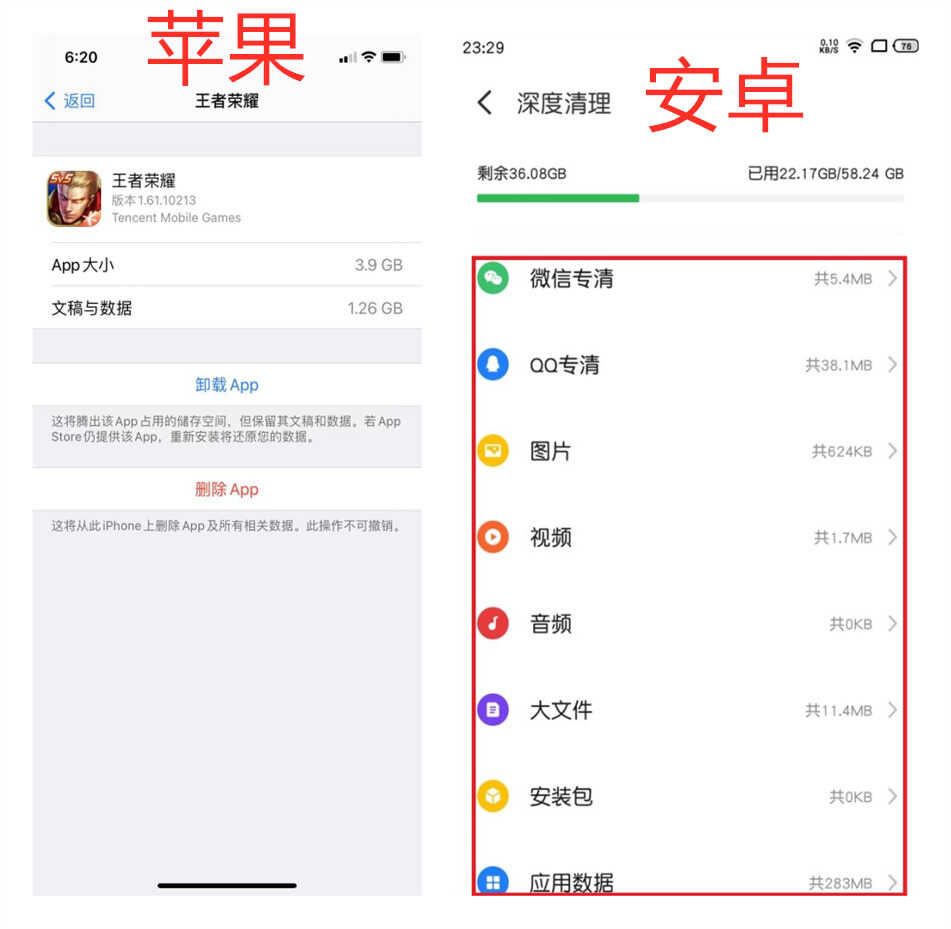 安卓:点击手机管家,进入深度清理,找到个软件残留的安装包,然后进行删除。