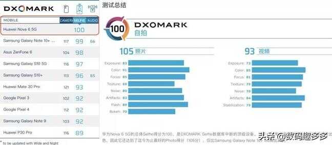华为Nova 6系列主打前置双摄32MP+8MP超广角 F/2.2,是华为首款支持前置4K视频的机型,同时送测DxOMark自拍位列第一 综合105分;