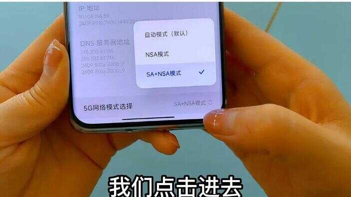 而系统默认的都是自动模式,在这里我们给他选择最后一个SA加NSA的模式,勾选一下这样我们就把五g网络模式的选择更改好了,这样你再去下载软件体验一下,他的网速,就会至少提升十倍以上,