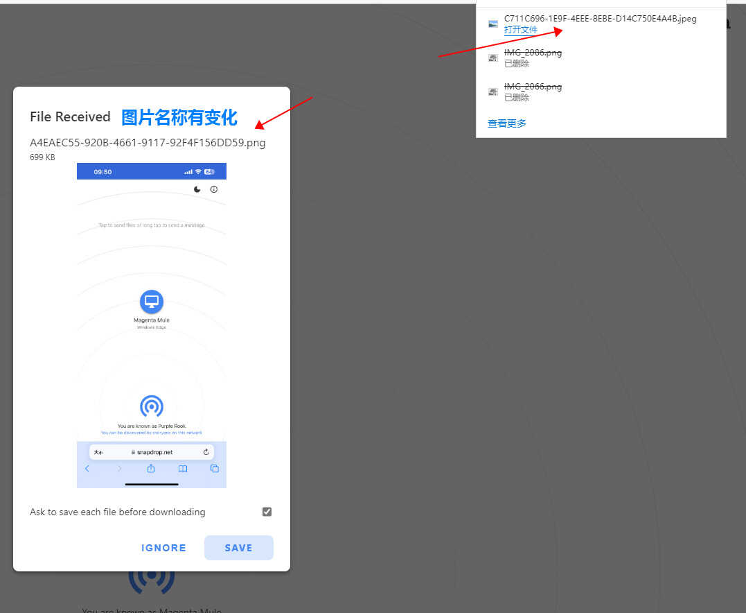 相同局域网下访问 snapdrop 的浏览器,iPhone 点击屏幕上出现的电脑端浏览器图标,可以发送照片或文件,电脑端的浏览器则会弹出下载框。不需要通过任何服务器进行中转,传输速度非常快。