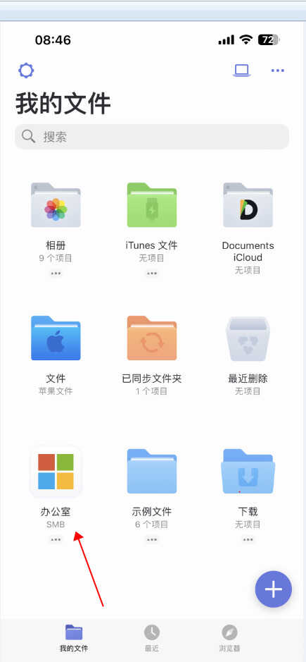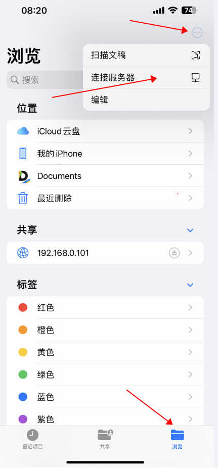 点击右下角浏览——右上角三个点点——选择链接服务器——输入ip地址——选择注册用户,输入用户名密码,选择下一步就可以看到你在电脑端新建的共享文件夹