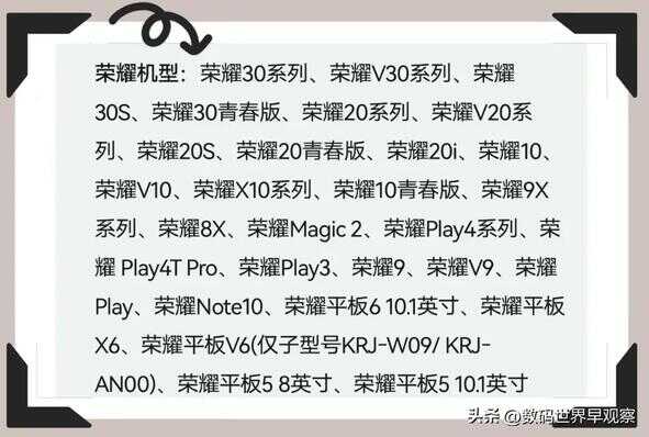 荣耀手机升级鸿蒙系统支持机型:荣耀30系列、荣耀V30系列、荣耀30S、荣耀30青春版、荣耀20系列、荣耀V20系列、荣耀20S、荣耀20青春版、荣耀20i、荣耀10、荣耀V10、荣耀X10系列、荣耀10青春版、荣耀9X系列、荣耀8X、荣耀 Magic 2、荣耀Play4系列、荣耀Play4T Pro 、荣耀Play3、荣耀9、荣耀V9、荣耀 Play 、以及荣耀Note10。