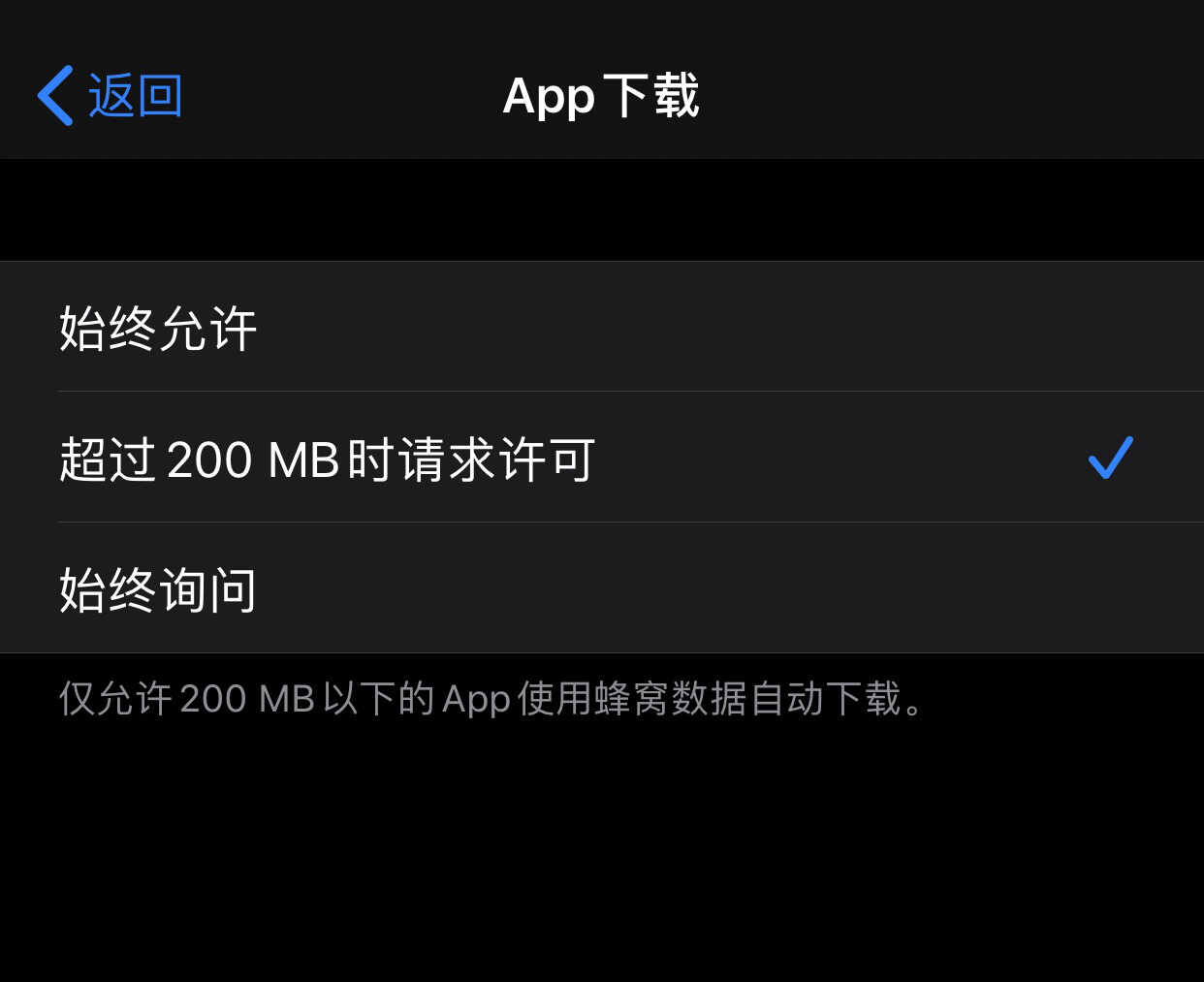 用户在系统升级后打开设置,进到“iTunes 与App Store“ 选项,再将该选项往下滑,就可看到iOS13中新增加的APP下载,用户进入“App 下载”项后就能选择“始终允许”“超过200MB时请求许可”以及“始终询问”三个选项,便可以按照自己的流量状况来调节App的下载限制。