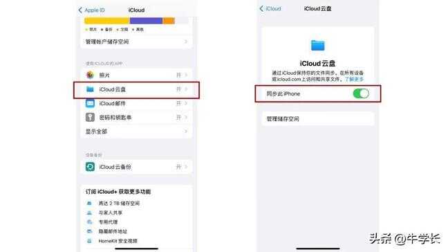 打开iPhone【设置】-【Apple ID】-【iCloud】界面,首先确认【iCloud云盘】是否开启“同步此iPhone”,将其开启才能云盘与设备数据同步。